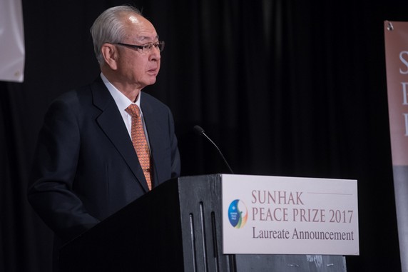Dr. Il-sik Hong, Vorsitzender des Sunhak Peace Prize Komitees, gibt die Preisträger bekannt