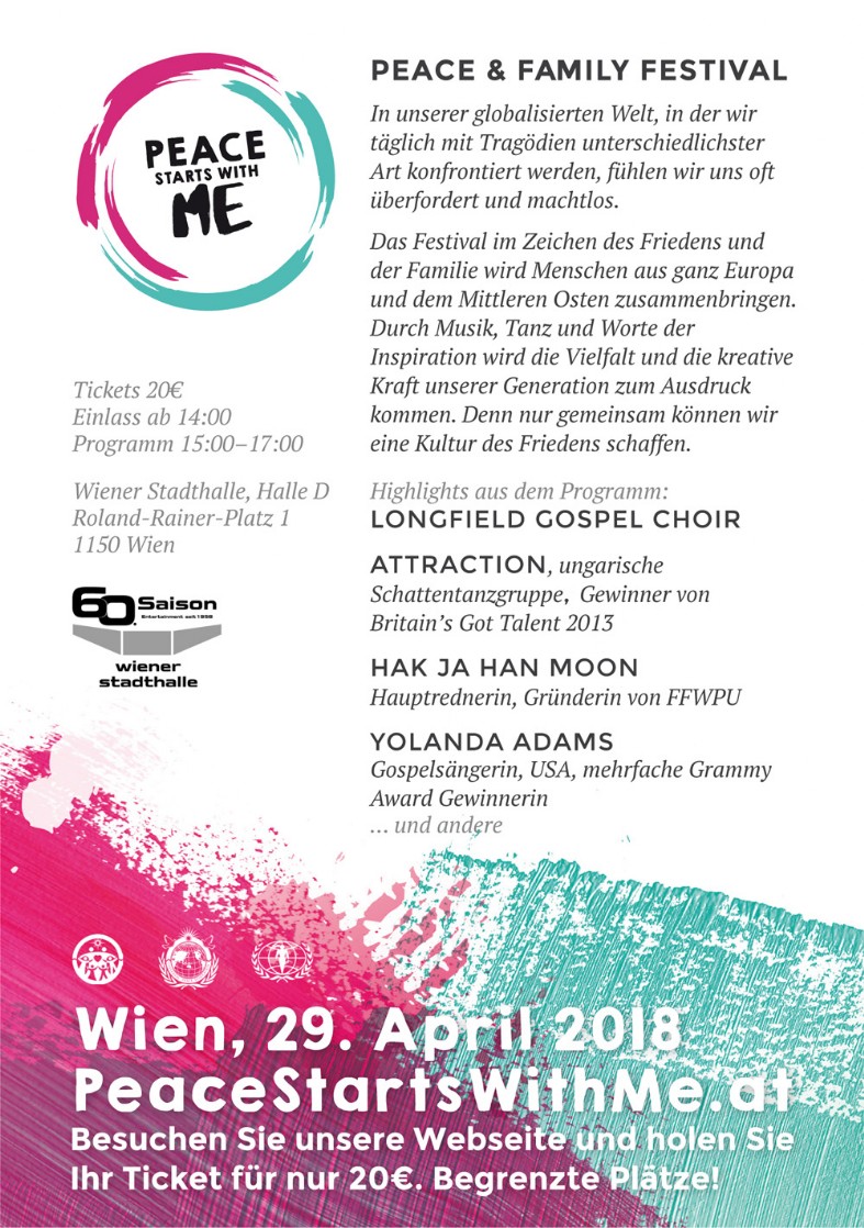 „Peace starts with me – Der Friede beginnt mit mir”: Das ist das Motto des Festivals, das am 29.04.2018 in der Wiener Stadthalle stattfinden wird.